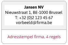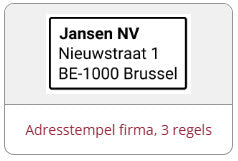 Afhankelijk van het gebruik kan de stempel minimalistisch zijn (alleen bedrijfsnaam en adres) of uitgebreid (inclusief belastingnummer, bankgegevens, enz.). Een bedrijfslogo zorgt voor een professionele uitstraling!